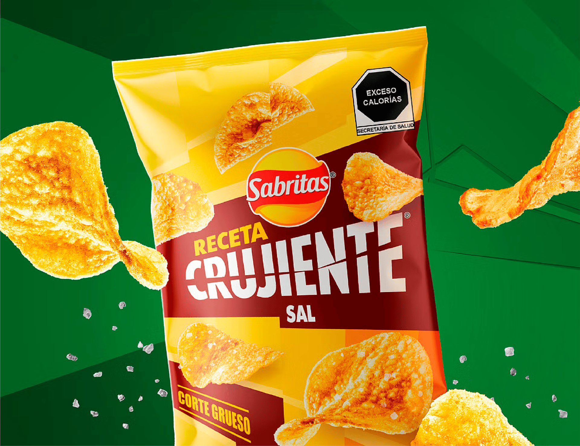 Diseño gráfico para empaques Receta Crujiente Sabritas®, para presentaciones Sal, Jalapeño y Flaming Hot.